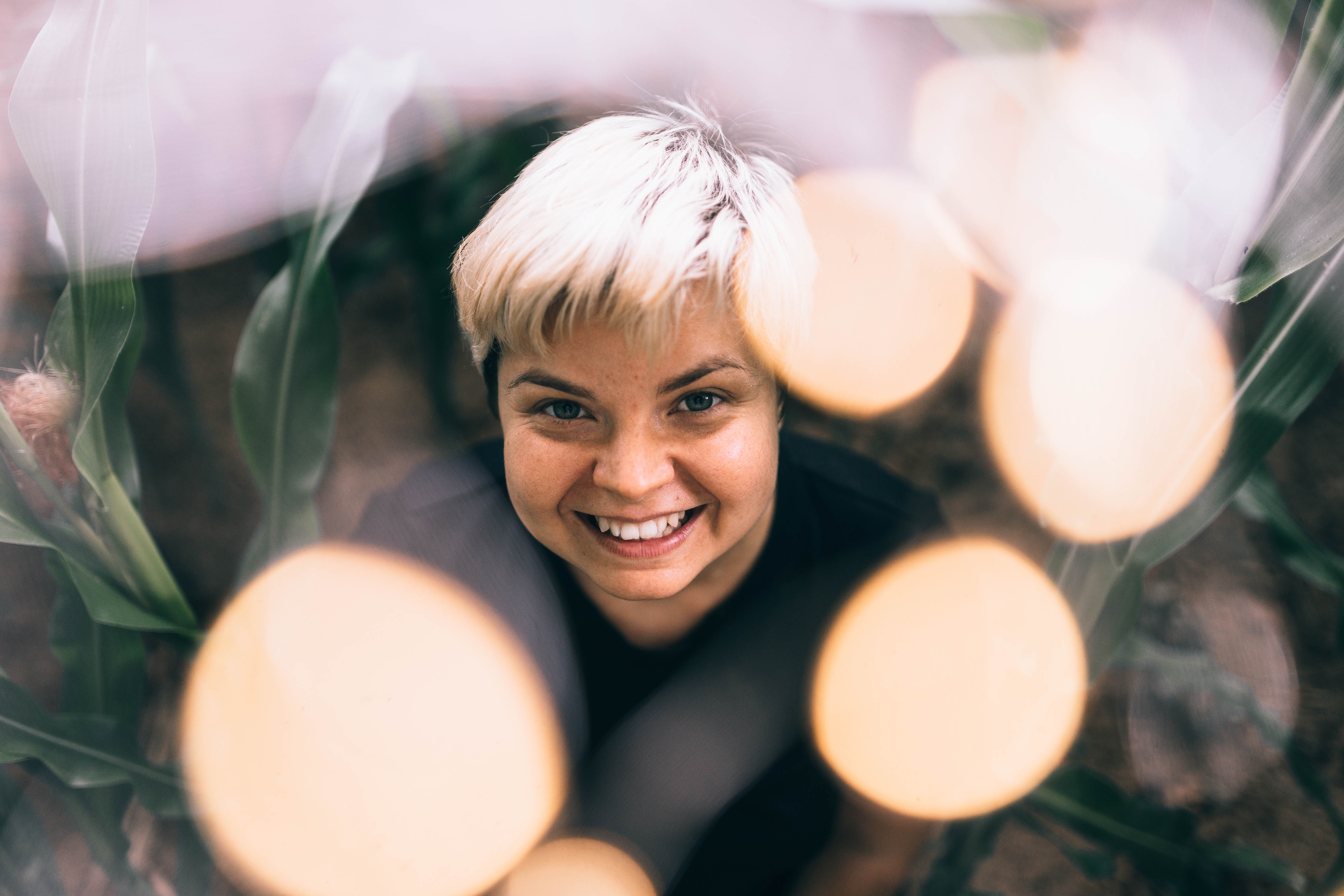 Just like when we shot the spikes photo, Kristina’s body language started changing again as I draped the sparkling Christmas lights over her arms. She had a smile, maybe not intentionally, but real and soft. Her voice was quiet but warm and she was laughing and the experience felt vastly different from the spikes photo only a few minutes before. The rows of corn provided a rather peaceful space to work in, the wind gently blowing the stalks and the far off sounds of the trains rumbling through the hills was a beautiful soundtrack to this “Better” moment.